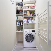 Так же предусмотрена прачечная. Установлена стиральная машина. Сушилка потолочная. И полки для хранения.