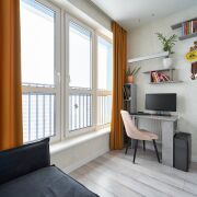 Кабинет: панорамное окно в пол, с оборудованным рабочим местом.