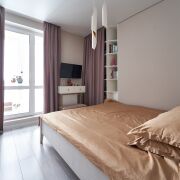 Спальня: панорамные окна в пол, с установленной большой кроватью и выход на просторную лоджию с прекрасным видом на весь город.