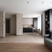 - Пол в прихожей, кухне и санузле выполнен плиткой Nowa Gold польского производства. Встроена система электрического подогрева. В жилых комнатах и гардеробной уложена паркетная доска Coswick, подчёркивающая натуральный характер отделки.