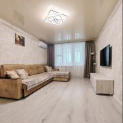 потолок, полы - светлый ламинат, на кухне линолеум, в санузлах плитка.