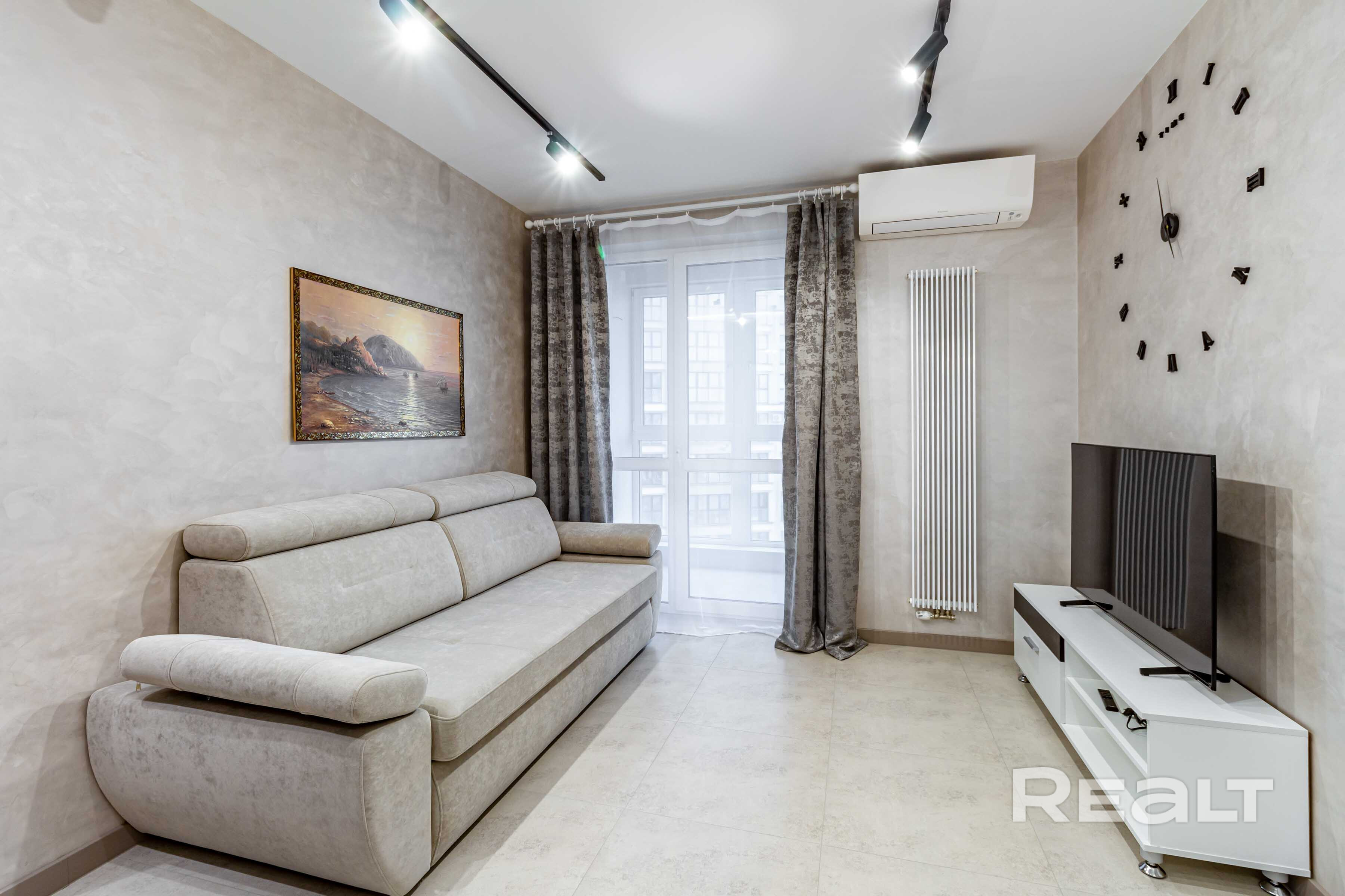 Стены квартиры покрыты декоративной штукатуркой, за исключением спален, где в одной из них отделка выполнена на стене за изголовьем кровати. Полы по всей квартире, включая балкон, а также стены в ванной и туалете облицованы прочным и элегантным керамогранитом. Установлен теплый пол для дополнительного комфорта. Просторная кухня-гостиная с практически всей техникой Bosch — это тренд последних лет.