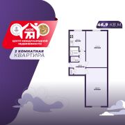 -Квартира расположена на 1 этаже 5-этажного дома с общей площадью 46,9 кв.м и жилой площадью 33,7 кв.м.