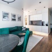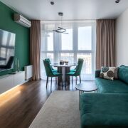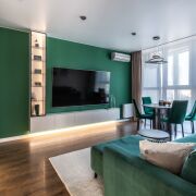В зоне гостиной-столовой установлен кондиционер, обеденный стол – трансформер, раскладывающийся диван с полноценным спальным местом.