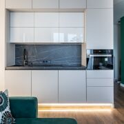 Встроенная кухня оснащена всей необходимой бытовой техникой: варочной поверхностью Maunfeld, духовым шкафом + СВЧ -печь Maunfeld, посудомоечной машиной 60 см Maunfeld, встроенным холодильником Gorenje, установлена система очистки воды Аквафор.