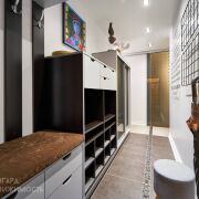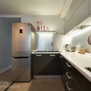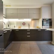 Большая кухня 9.2 м2 оборудована всей необходимой мебелью и техникой от ведущих мировых брендов, а ее размер и форма позволит вам проводить время всей семьей с комфортом. На полу и в рабочей зоне на стене уложена плитка.