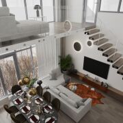 - высота потолков 5,4м в зоне кухни-гостинной, в других комнатах 2,7м;
