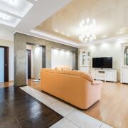 -В прихожей, кухне и санузлах - напольное покрытие представлено качественным кафелем, в жилых комнатах - уложен ламинат премиум класса.