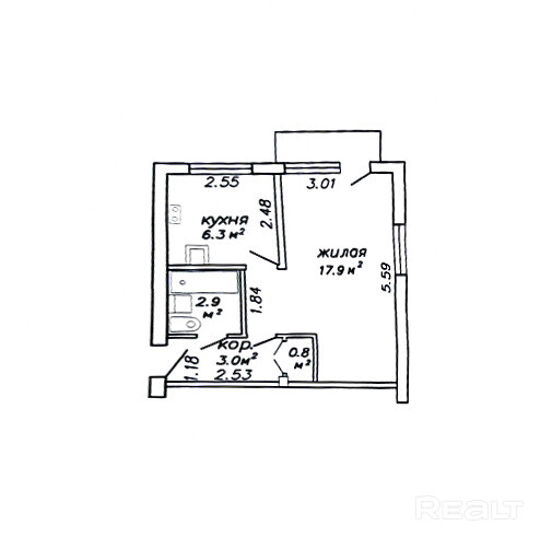 Жилая комната: 17,9 м2 Кухня: 6,3 м2.