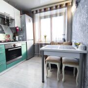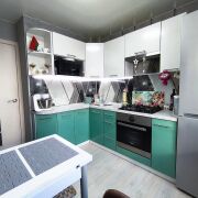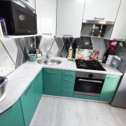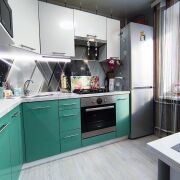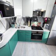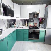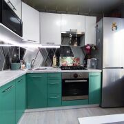 Современные обои. Угловая кухня со встроенной импортной техникой.