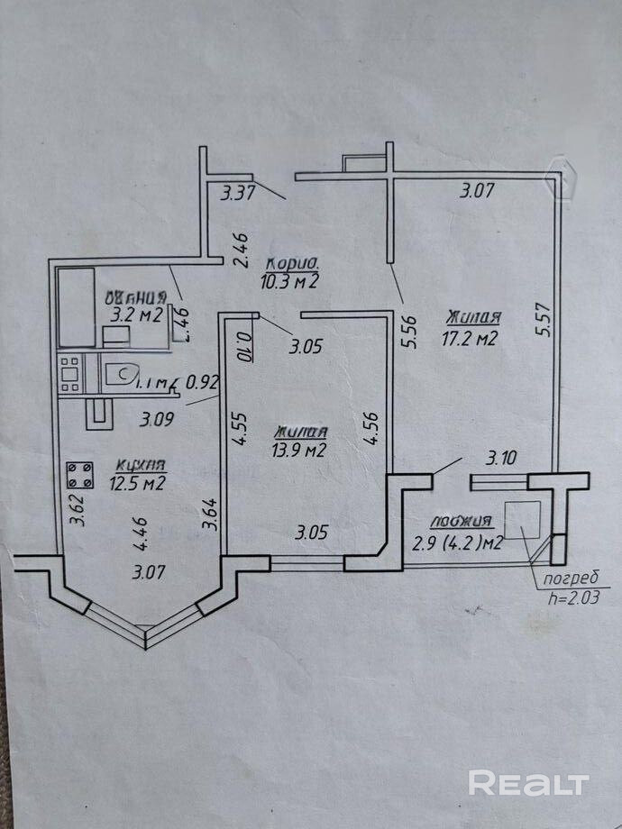 Общая площадь: 61,1 м2 (жилая — 31,1 м2, кухня — 12,5 м2 с эркером)