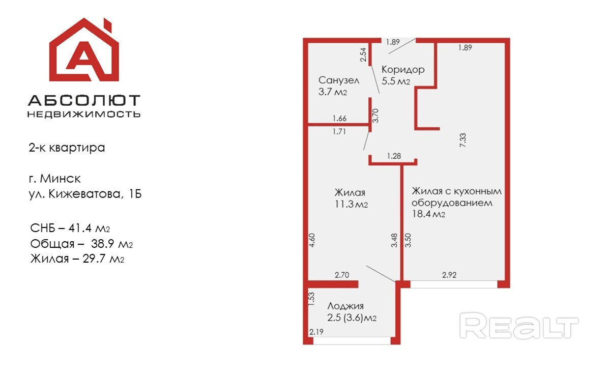 -Квартира: площадь квартиры по СНБ - 41,4 м2, общая площадь - 38.9 м2, жилая – 29.7м2. Это идеальное место для комфортной жизни семьи. Квартира светлая, солнечная, окна квартиры выходят во двор. Квартира расположена на 5 этаже. В квартире 2 окна от пола до потолка, что задает высокий уровень инсоляции-естественного освещения солнечными лучами в помещении. Высота потолков -2,74м. Санузел совмещенный, площадью-3,7м2.