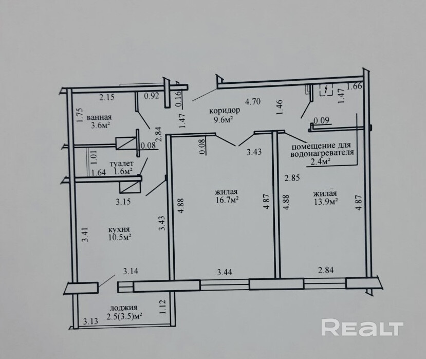 Площадь по СНБ - 60,8 м2, общая - 58,3 м2,  кухня - 10,5 м2. Высота потолков 2,63 м, что создает ощущение простора и света. Окна выходят на запад.