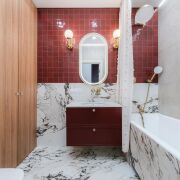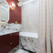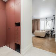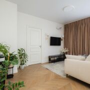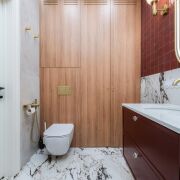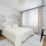 -Интерьер выполнен в современном спокойном стиле с акцентом на качество материалов и тактильный комфорт. На полу уложен дубовый паркет — тёплый, долговечный и статусный материал.. В мокрых зонах использована итальянская плитка — практичная и визуально эстетичная.