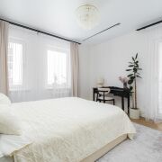 -В спальне установлен экран проектора — решение для домашнего кинотеатра без лишних проводов и техники.