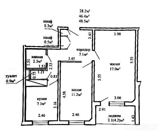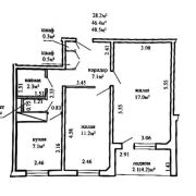 1й этаж. Площадь квартиры по СНБ 48,5 кв.м. Застекленная лоджия. Окна стеклопакеты. Ремонт в квартире делался около 15 лет назад. 2 комнаты площадью 17,0 и 11,2 кв.м. Из комнаты 11,2 кв.м сделан вход в кухню. С/у совмещен.