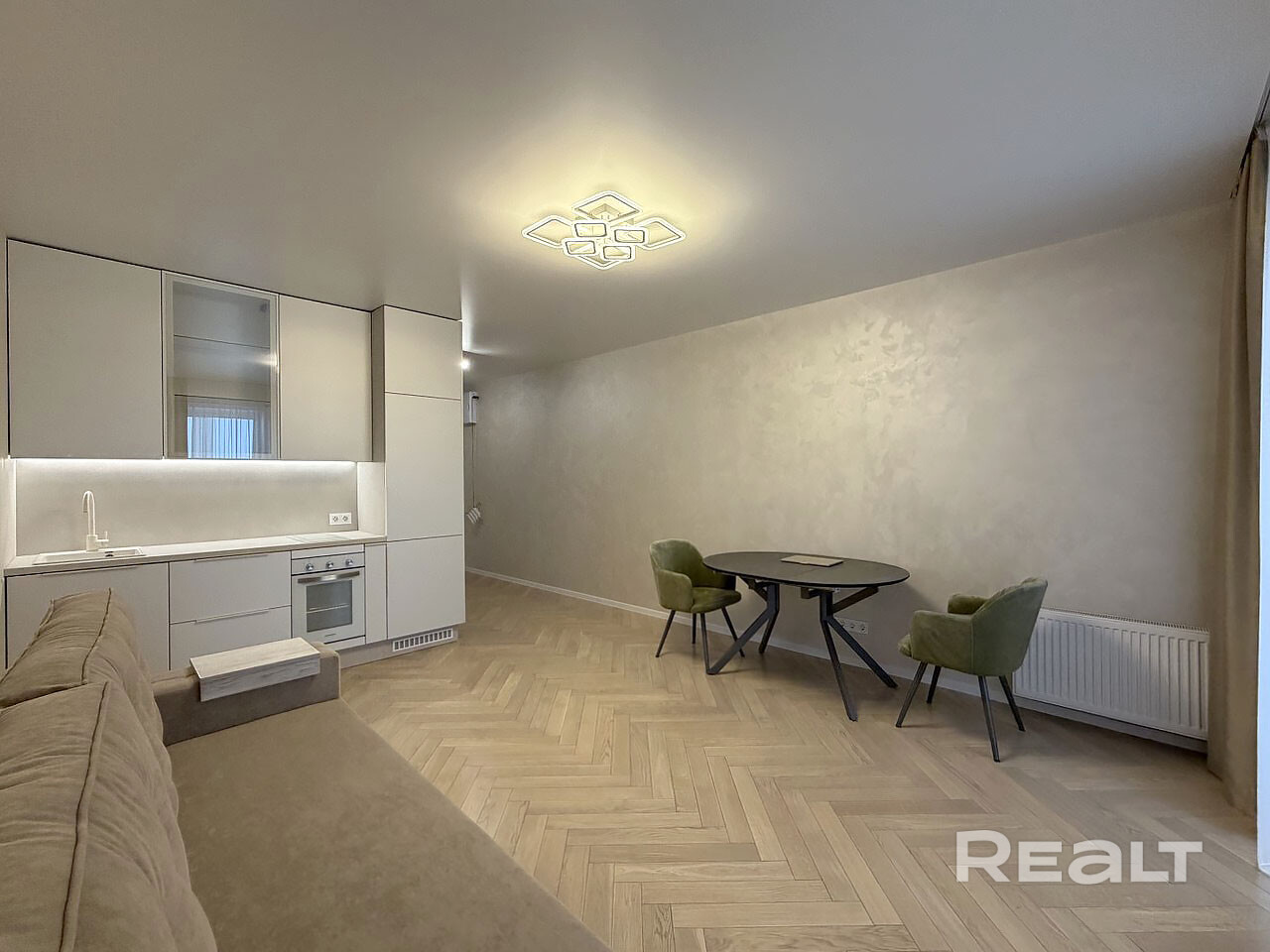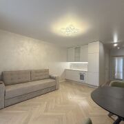 Сделан отличный ремонт, электрический щиток с автоматами заведён в квартиру, все поверхности выровнены, напольное покрытие-парке, стены-декоративная штукатурка, потолок матовый натяжной со скрытыми карнизами.