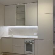 Встроенная кухня от компании Зов, укомплектована доводчиками, установлена подсветка рабочей зоны и встроенная техника Maunfeld (индукционная варочная поверхность, духовой шкаф и холодильник).