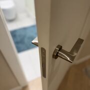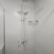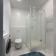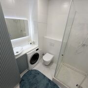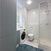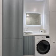 Санузел за стильной белой дверью со скрытыми петлями и магнитными замками, облицован плиткой, установлена инсталляция Teceс подвесным унитазом, душевая кабина с щелевым трапом, современный смеситель и душевая стойка белого цвета, столешница с накладной раковиной, зеркало с подсветкой, корпусный шкаф, стирально-сушильная машинка LG, а все коммуникации спрятаны за скрытым люком.