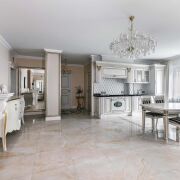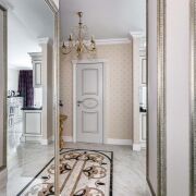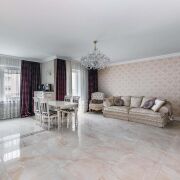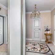 - В отделке использованы только премиальные материалы. Установлены итальянские двери с литой латунной фурнитурой и надёжным замком Union. Стены оформлены текстильными обоями итальянского производства, а пол и стены в ванной отделаны итальянской плиткой. Санфаянс бренда Jacob Delafon подчеркивает уровень качества. В душе установлена система тропического дождя. Освещение продумано до мелочей. Чешские люстры с 24-каратным золочением наполняют комнаты мягким светом. Выключатели и розетки эксклюзивные, итальянского производства.