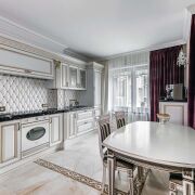 - Кухня укомплектована современной техникой известных брендов. Встроенный холодильник Electrolux работает бесшумно. Духовой шкаф Smeg и индукционная варочная панель Electrolux позволяют готовить с удовольствием. Микроволновая печь Gorenje выполнена в классическом стиле. Стиральная машина AEG и сушильная Bosch экономят время. В квартире есть кофемашина и кофемолка DeLonghi, водонагреватель Electrolux и система тёплого пола, которая создаёт приятное ощущение заботы о деталях.