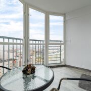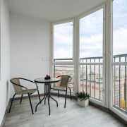 -Застекленная уютная лоджия станет отличным местом для отдыха или хранения.