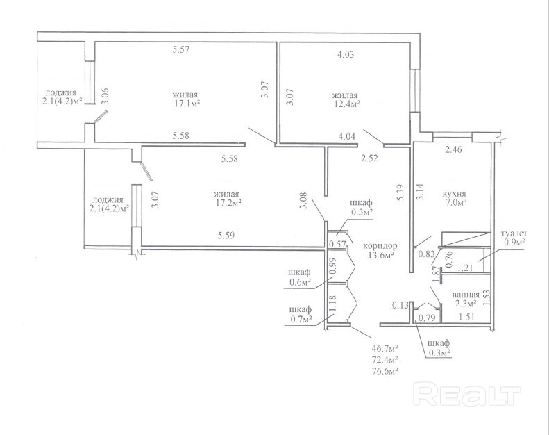 · Функциональная планировка: 3 комнаты (17,1 м2, 17,2 м2и 12,4 м2), раздельный санузел, 2 просторные лоджии