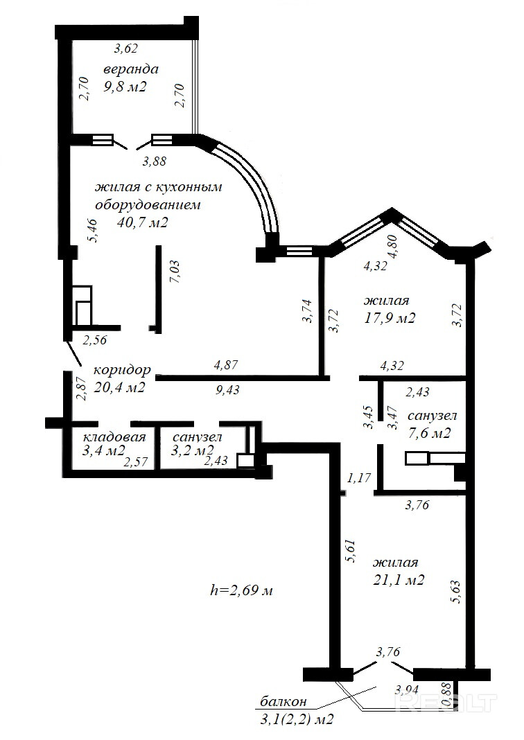 Новостройка. Два санузла. Потолок – 2.7м., стеклопакеты, свободная планировка.