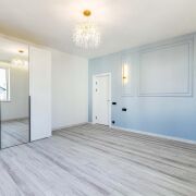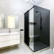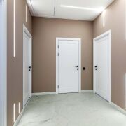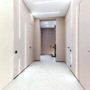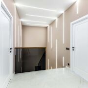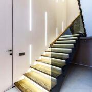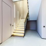 Лестница — настоящая изюминка: стеклянные ограждения, натуральное дерево и подсветка ступеней создают премиальную атмосферу.