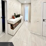 Возможность разделения кухни от общего пространства, продуманное освещение, дизайнерская столешница из кварцевого агломерата с интегрированной мойкой.