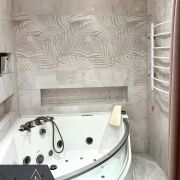 Просторная ванная (7 кв.м.) с джакузи для двоих: немецкое качество, современный дизайн, гидро и аэромассаж, романтическая подсветка и встроенное радио, подогрев и озонирование воды.