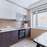 Кухня (7,22 кв.м.) укомплектована необходимой техникой (электрическая варочная панель, духовой шкаф, вытяжка, печь СВЧ, холодильник), обеденная группа.