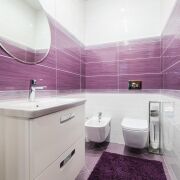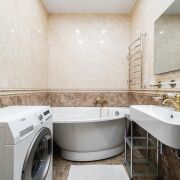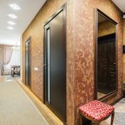 - В отделке использованы изысканные материалы: в спальне - итальянские обои, в гостиной и прихожей - венецианская штукатурка, на полу - дубовый паркет и испанская плитка в кухне и санузлах. Ванная комната оснащена эксклюзивной сантехникой из литого камня латвийского бренда RAA.