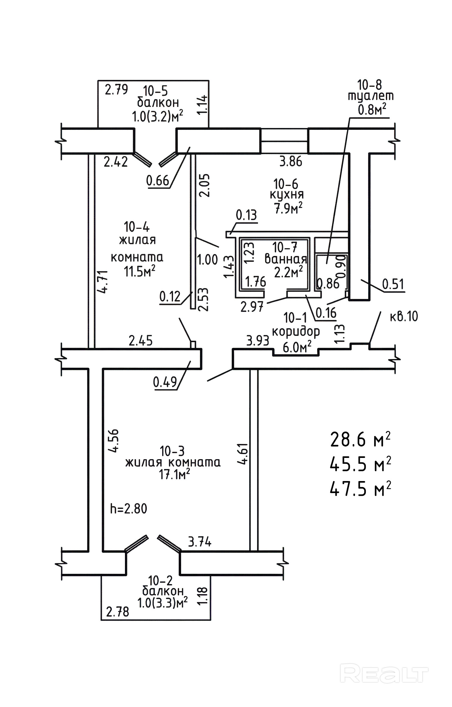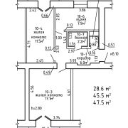 Общая площадь квартиры по СНБ (с двумя открытыми балконами) 47,5 кв.м., общая жилая площадь 45,5 кв.м., общая площадь жилых комнат 28,6 кв.м.