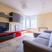 · Комфортная просторная гостиная 20,2 кв.м. Вся мебель выполнена на заказ. Домашний кинотеатр, мягкий комфортный диван - и ваше время с семьёй будет очень уютным. Подоконник из натурального мрамора добавляет стиля и качества.