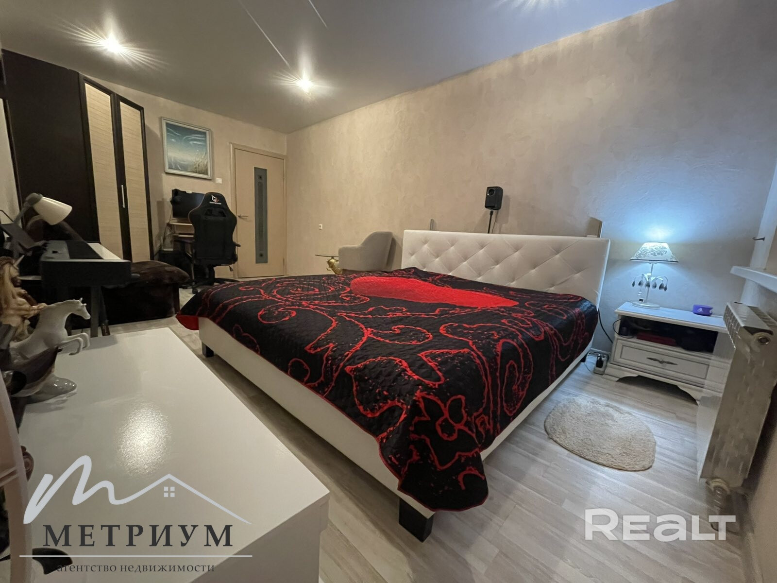 Комната правильной формы , что позволяет сделать зонирование на спальную и рабочую зону.