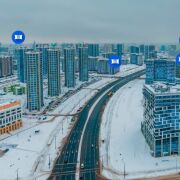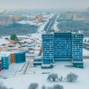 - вид на башни МФЦ и самый большой торговый центр в Минске Avia Mall, в котором есть кинотеатр, фудкорты, магазины и зон отдыха