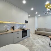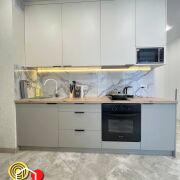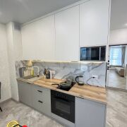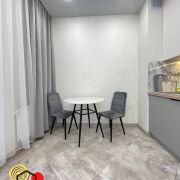 Просторная кухня-гостиная, сердце этой квартиры, свободно объединяет в себе две зоны: уютную зону отдыха и функциональную кухню. Кухня оснащена современной техникой: духовым шкафом, электрической варочной панелью, СВЧ печью и мощной вытяжкой, что делает приготовление пищи настоящим удовольствием. Современная мебель и стильный диван со столом со стульями создают гармоничное и эргономичное пространство.