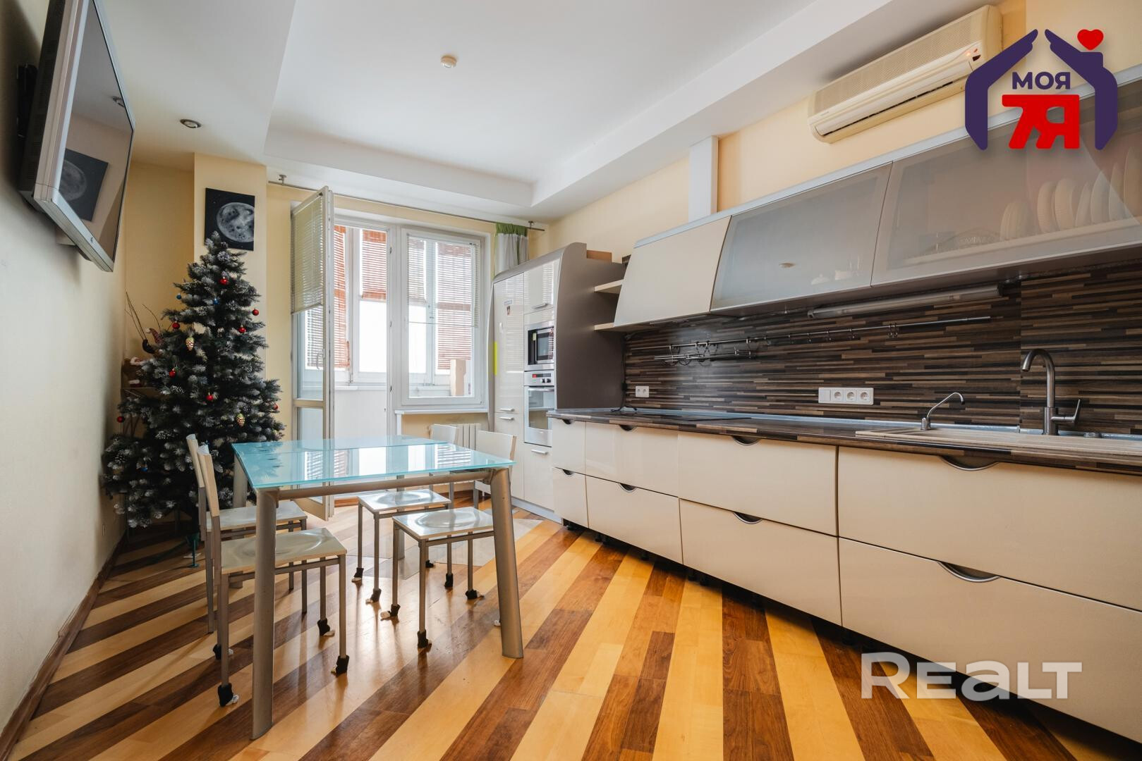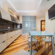 - Кухня оборудована современным гарнитуром со встроенной техникой BOSH. Холодильник, посудомоечная машина, варочная панель, духовой шкаф и вытяжка уже установлены. Дополнительно предусмотрен кондиционер и встроенный шкаф купе.