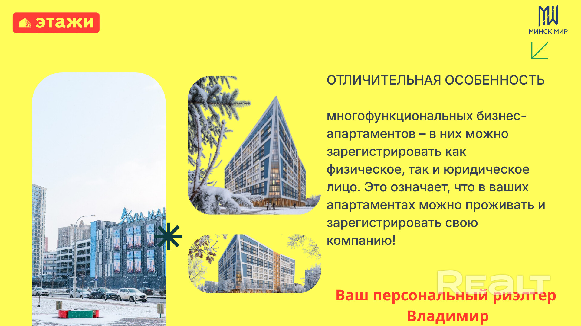 1. Можно заселиться, приобретя апартаменты, зарегистрироваться по месту жительства, а затем, если у вас возникнет желание, произвести регистрацию юридического лица любой формы собственности и открыть свое дело в «Минск-Мире» – одной из выгодных бизнес-локаций.