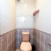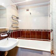 -Санузел раздельный, облицован плиткой в светлых и контрастных тонах, установлен полотенцесушитель и полноценная ванна — всё аккуратно и в рабочем состоянии.