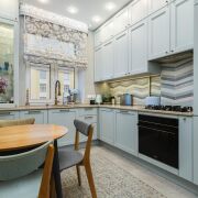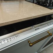- Кухня оборудована встроенным гарнитуром с крашеными фасадами и рабочей поверхностью из натурального камня. Вся техника фирмы SMEG входит в стоимость и включает духовой шкаф, вытяжку, посудомоечную машину, холодильник, варочную поверхность и стиральную машину.