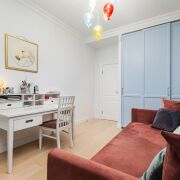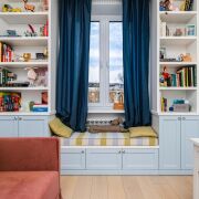 - В гостиной уложен паркет и установлена мебель премиум-класса. Комната выходит на открытый балкон, откуда открывается вид во двор. Спальня и детская оформлены аналогично: паркетная доска, качественные обои, окрашенные потолки. Вся обстановка остаётся покупателю.