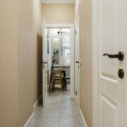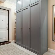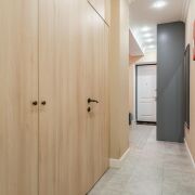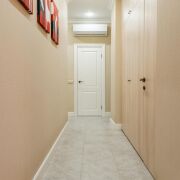 - В коридоре расположен встроенный шкаф с крашеными фасадами, на полу плитка. Работает охранная сигнализация. Входная дверь имеет повышенный уровень шумоизоляции.