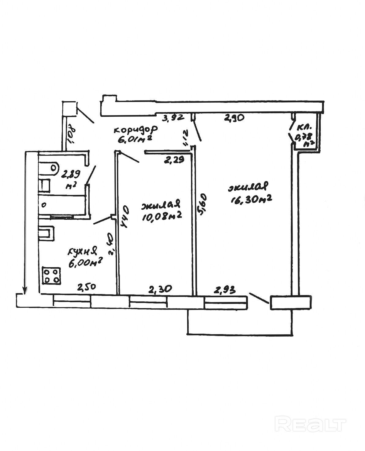 Общая площадь 42.06 кв. м, площадь по СНБ- 42.86, жилая 26.38 кв.м, кухня 6.0 кв.м.