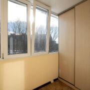 -Из просторной жилой комнаты есть выход на застеклённую лоджию, что даёт возможность использовать её как дополнительное пространство для отдыха или хранения. Здесь установлен шкаф, что удобно для хранения вещей.