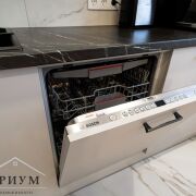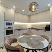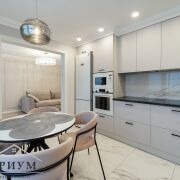 Это место, где собирается семья. Светлые оттенки стен и лаконичные фасады кухни создают ощущение воздуха и объема помещения. В центре — круглый стол (уютно и практично!). Вся техника встроена и только премиум-класса: посудомойка, духовка, микроволновка, индукционная панель, холодильник. Даже фильтр для воды и розетка под измельчитель отходов уже готовы! А в жару вас спасет кондиционер в гостиной.