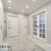 Входная дверь изнутри, межкомнатные двери и фасады шкафов — всё из крашеного МДФ. Это дорого и стильно. В жилых комнатах теплый ламинат, в коридоре, кухне и санузле — практичный керамогранит.