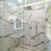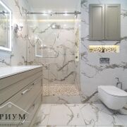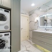 Просторный, с душевой кабиной, гигиеническим душем, бойлером. В шкафу спрятаны отдельно стоящие стиральная + сушильная машины (прощайте, вечные веревки с бельем!). Подсветка встроена даже в тумбы и душевую — мелочь, а как преображает!