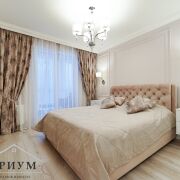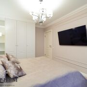 Уютная спальня с кроватью с мягким изголовьем, прикроватными тумбами, освещением с разными сценариями и вместительным шкафом. Приятный сливочный оттенок стен создают атмосферу расслабленности, а симметричные раскладки молдингов с розетками для светильников добавляют интерьеру изысканности. Из спальни можно попасть на теплую уютную лоджию, с плетеной мебелью.